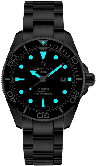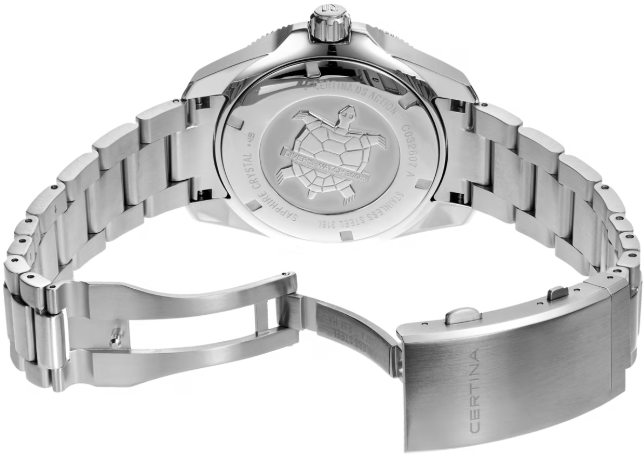 В XXI-м веке к часам предъявляются высокие требования. Дорогие наручные часы должны быть лучшими во всех отношениях – с точки зрения стиля, надежности и точности хода. Новая модель популярной коллекции DS Action Diver швейцарской марки Certina несомненно станет победителем этой гонки. Дайверские часы диаметром 43 мм отличаются классическим вневременным дизайном, водонепроницаемостью до 300 м и современным автоматическим калибром с пружиной, обладающей антимагнитными свойствами. Для корпуса, браслетов и застежек своих часов марка Certina использует нержавеющую сталь 316L, отличающуюся повышенной износостойкостью, устойчивостью к коррозии и гигиеничностью. В стали содержится совсем небольшое количество никеля, поэтому этот материал не вызывает аллергии при носке. Керамика, используемая в часовом искусстве, обжигается при температуре более 900 °C, что обеспечивает ее высокую прочность. Керамические безели, кабюшоны и детали браслетов марки Certina имеют не только красивый внешний вид, но обладают устойчивостью к царапинам, гипоаллергенностью и способностью долгое время сохранять первоначальную яркость и блеск. Super-LumiNova (SLN) представляет собой cветящийся материал с фосфоресцирующими свойствами. В темноте SLN типа BG W9, который использует Certina, испускает свет в виде голубого мерцания. SLN не вредит здоровью и используется для нанесения на стрелки, индексы и безели. В темноте он через некоторое время теряет свои фосфоресцирующие свойства, но они автоматически восстанавливаются на свету. Сапфировое стекло состоит из порошка оксида алюминия (Al2O3), раскаленного до 2.000 °C. Получаемые в результате сапфировые пласты нарезаются на тонкие пластины, им придают требуемую форму и полируют. Сапфир абсолютно прозрачен, обладает высокой устойчивостью к царапинам и механическим повреждениям. По этим причинам сапфировое стекло стало неотъемлемой деталью концепции DS и используется во всех моделях Certina для защиты циферблата. Вес нетто 205 гр. Стекло сапфировое сдносторонним антибликовым покрытием. Водонепроницаемость до 300 метров. Часы для дайверов, разработанные в соответствии со стандартом ISO 6425:2018, водонепроницаемость до глубины 300 м . Диаметр корпуса 43 мм. Толщина 13.1 мм. Между креплениями 21 мм. Механизм ETA POWERMATIC 80.611 с запасом хода 80 часов и сплавом Nivachron. Запас хода показывает количество времени, которое могут идти механические часы без подзавода. Большинство часов имеют запас хода около 38-42 часов. Powermatic 80, инновационный автоматический калибр Certina имеет запас хода до 80 часов – почти в два раза больше, чем у сопоставимых моделей. Спирали баланса созданы из инновационного титанового сплава. Этот революционный материал был создан при сотрудничестве с компанией Swatch Group и используется лишь ограниченным числом брендов. Пружины Nivachron обладают повышенной устойчивостью к воздействию электромагнитных полей, ударам, старению материалов, экстремальному перепаду температур, выводят часы на совершенно новый уровень точности и обеспечивают долговечность аксессуара. Удлинение для надевания часов на гидрокостюм.